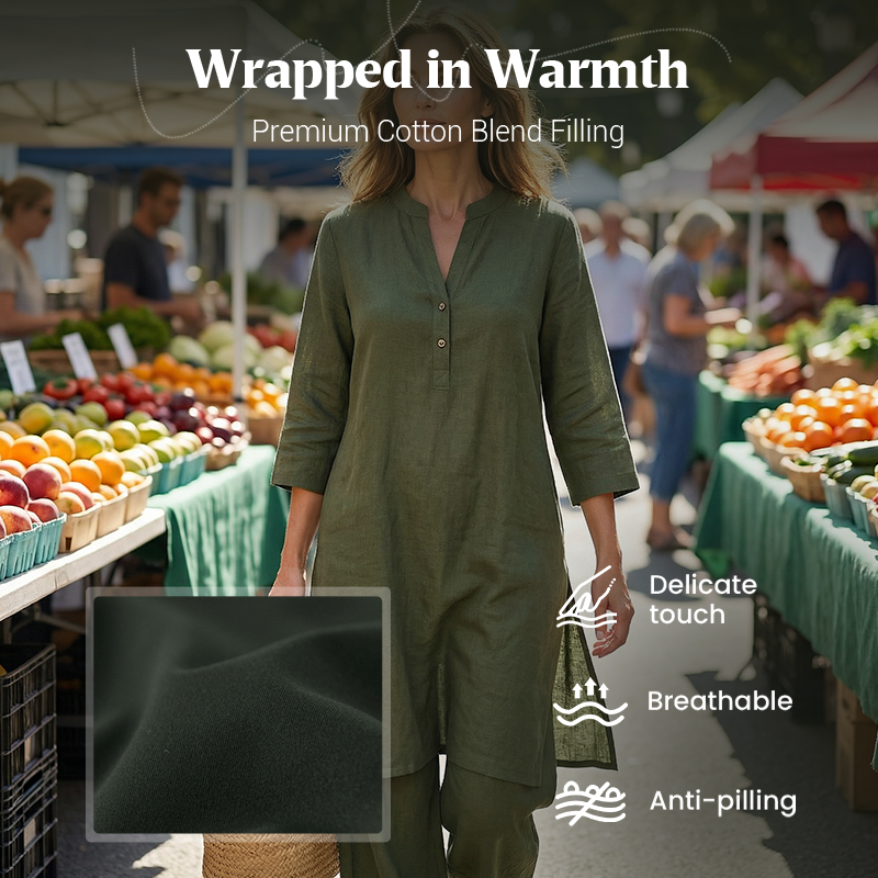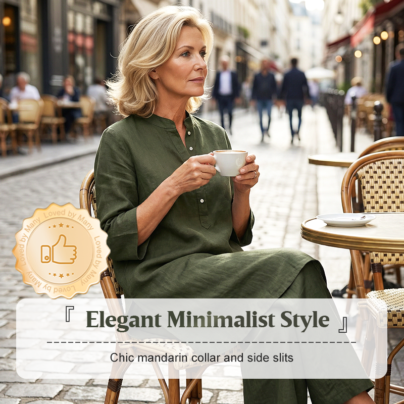 СТИЛЕН МАНДАРИНСКИ ЯКА - Класическата мандаринска яка и частично закопчаване с копчета придават нотка на вечна елегантност на този модерен комплект. Този изтънчен детайл подчертава небрежния дизайн, което го прави подходящ за различни непринудени поводи.