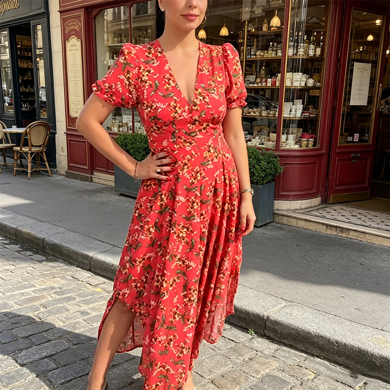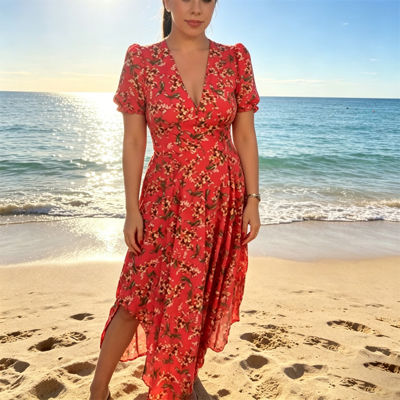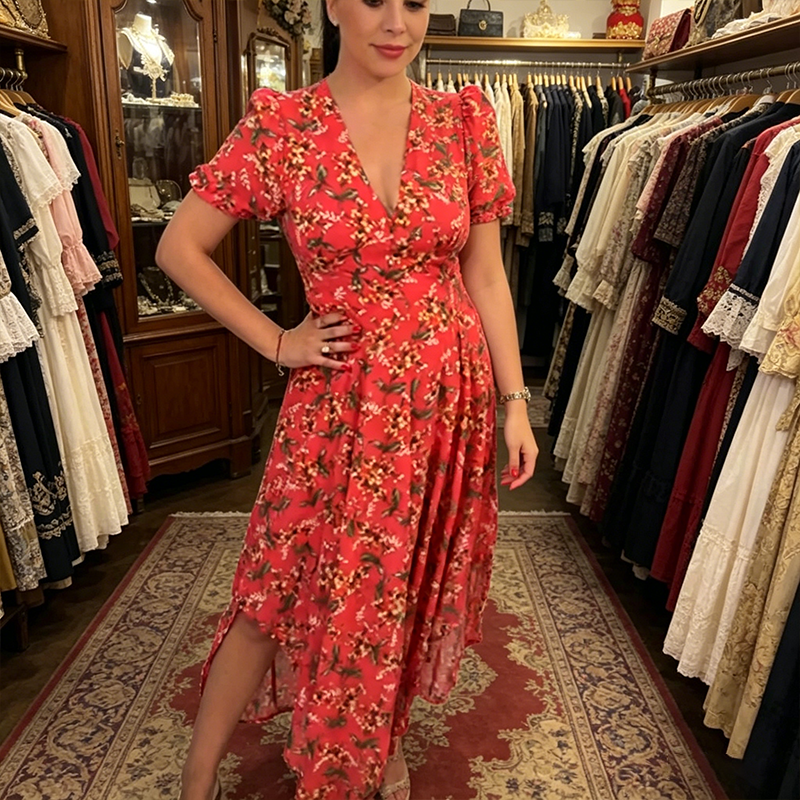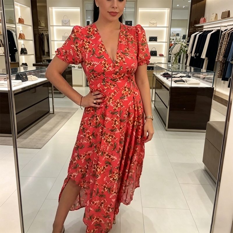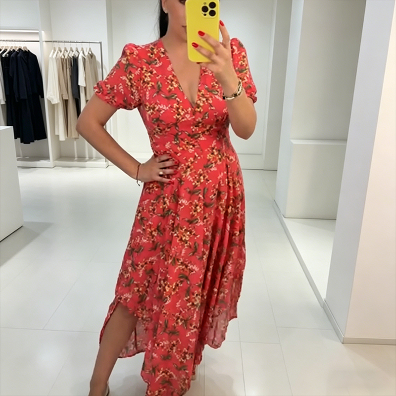 ЖИВ ФЛОРАЛЕН ПРИНТ – Украсена с красив флорален модел, тази рокля улавя същността на пролетта и лятото. Живият принт добавя цвят и женски чар, като гарантира, че ще се откроите с вечна елегантност.