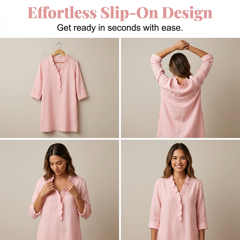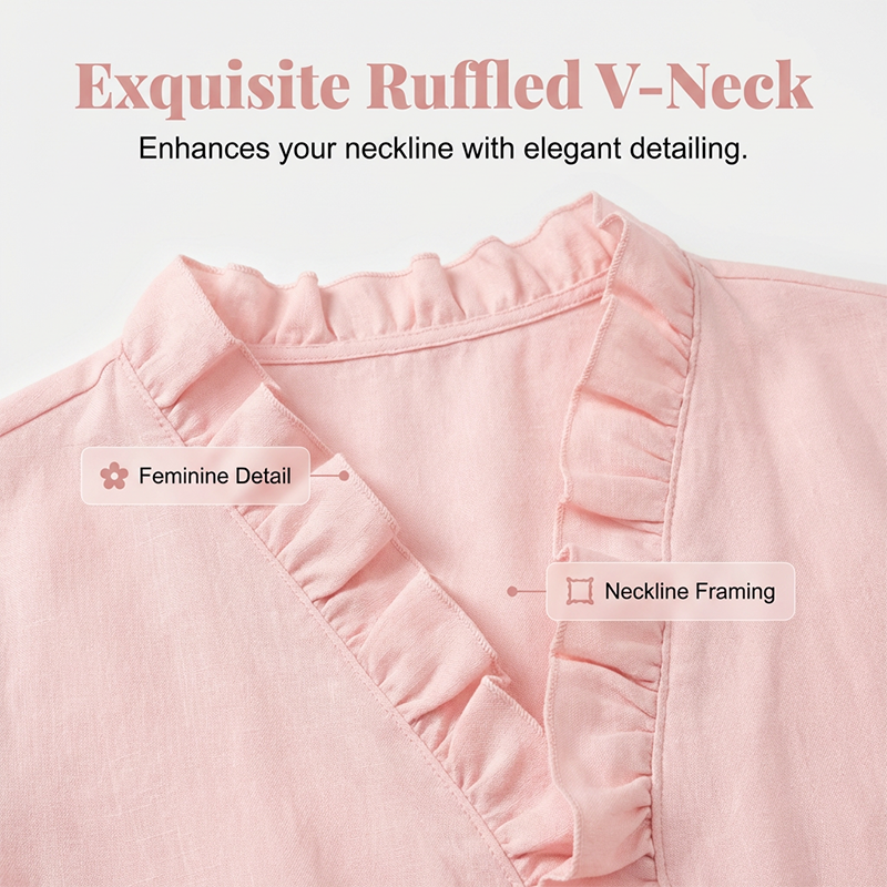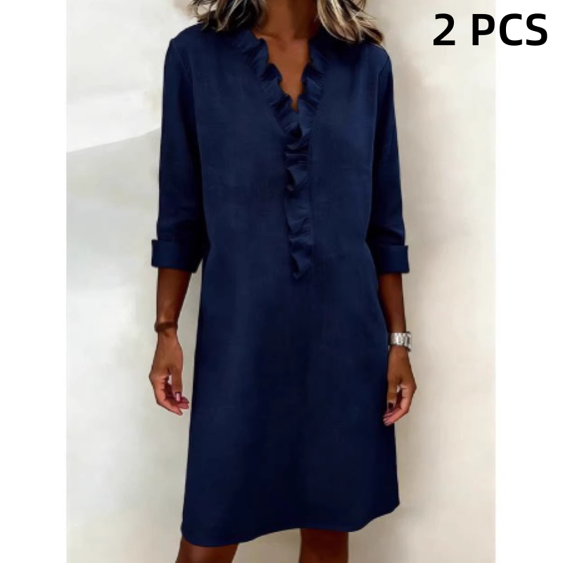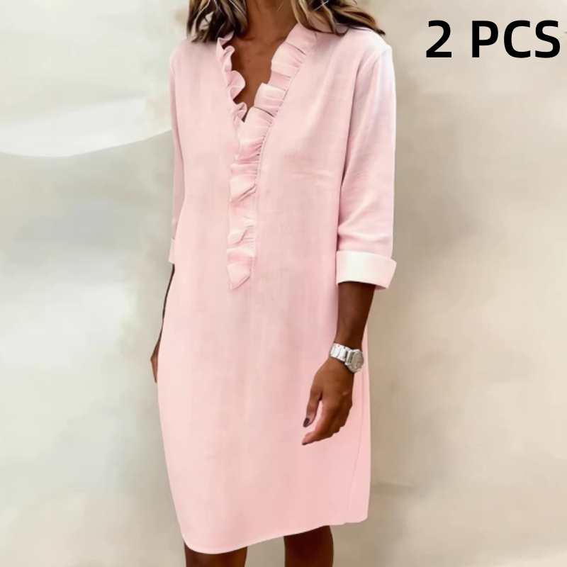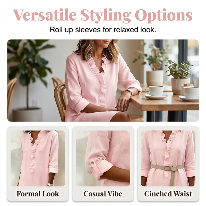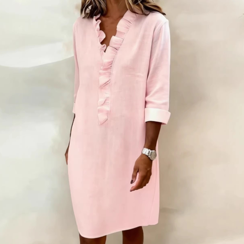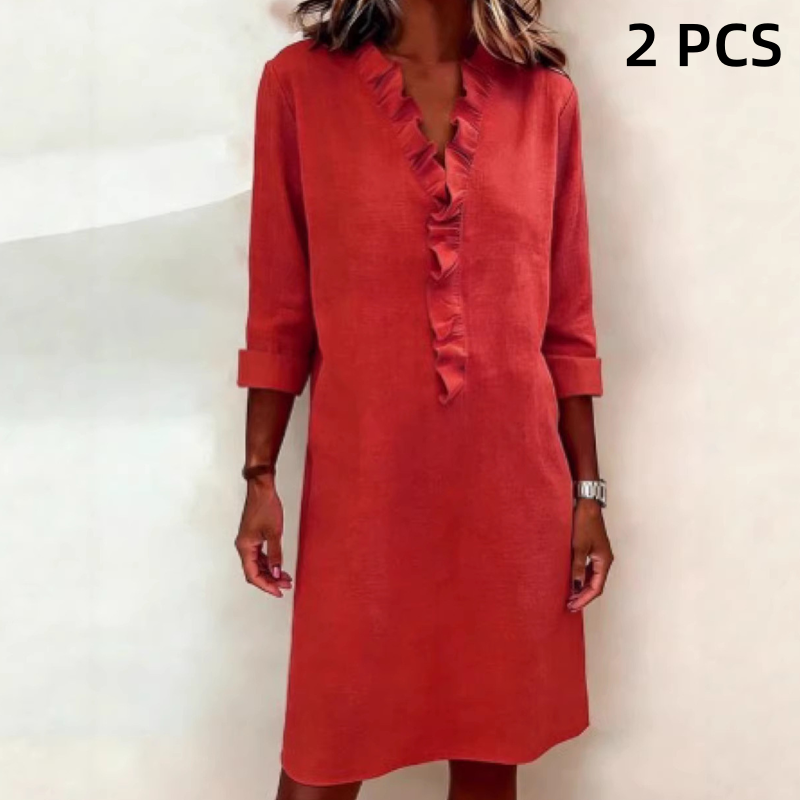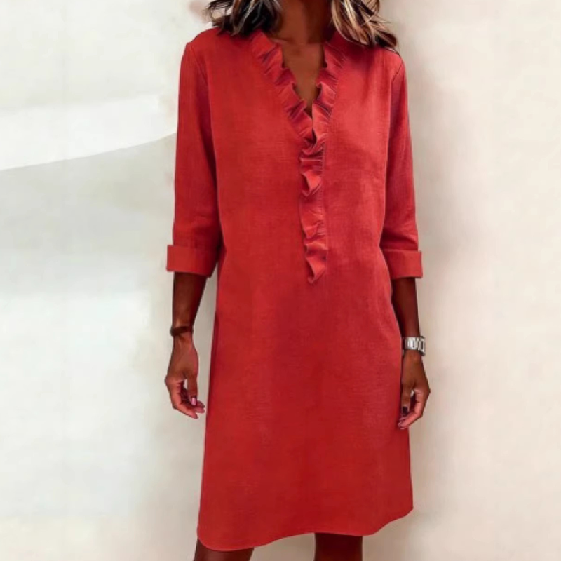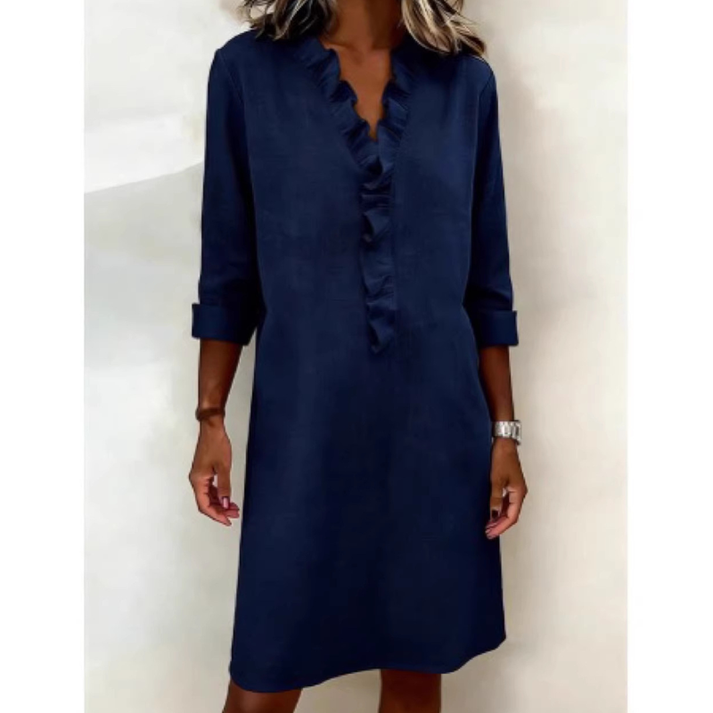Дамска рокля-риза от лен с V-образно деколте и волани